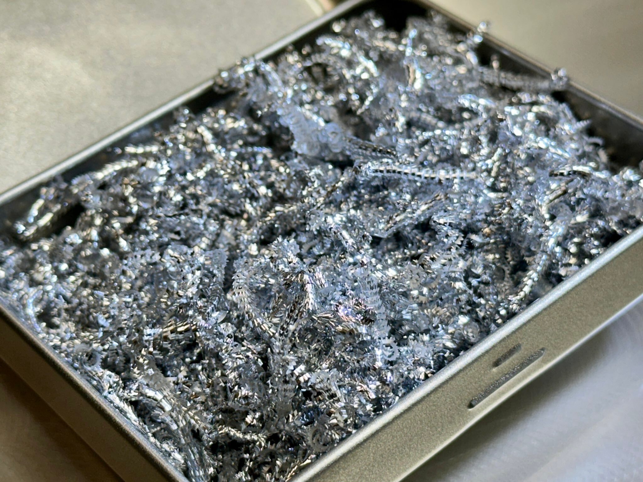 金属加工業で必ず出る切粉(キリコ)ですが、鏡面カットというHATAでの特殊な加工でのみ生まれる鏡面の切粉が入っています。